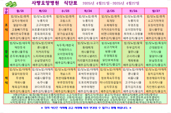 사랑요양병원 4월 넷째주 식단표