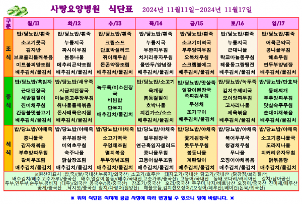 사랑요양병원 11월 둘째주 식단표